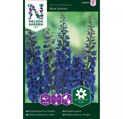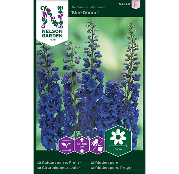 Praktridderspore med gammeldags sjarme som blomstrer med dypt blå, halvfylte blomster. Bør støttes eller dyrkes mot en vegg. Vakker som solitær og sammen med andre planter. Trives i moldrik gartnerjord, vannes ved tørke. Planten er giftig.